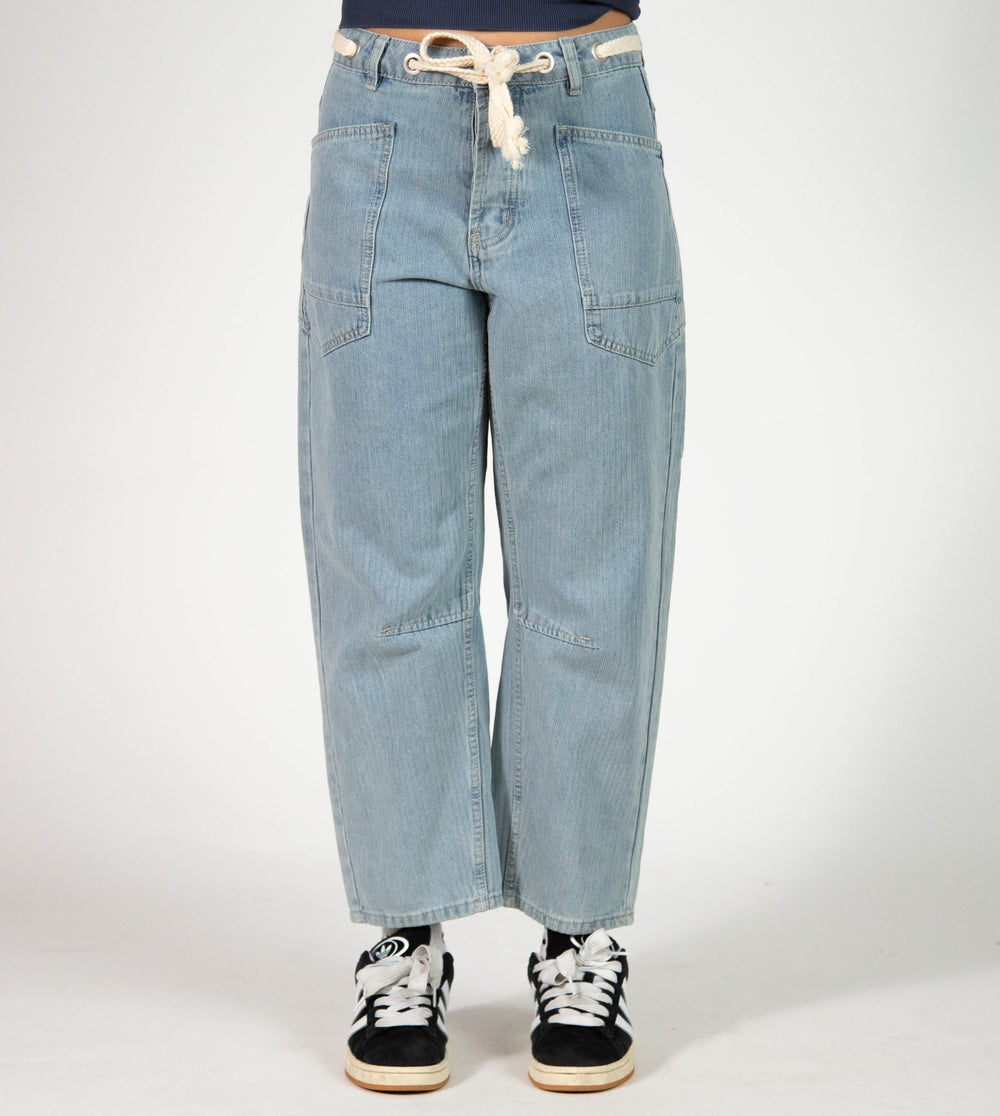 The Gina Pants are a modern take on relaxed denim, designed with a soft, lived-in wash and an easy, flattering silhouette. Featuring a comfortable rope drawstring waistband, oversized utility-inspired front pockets, and a gently tapered wide leg, these pants balance function with effortless style.